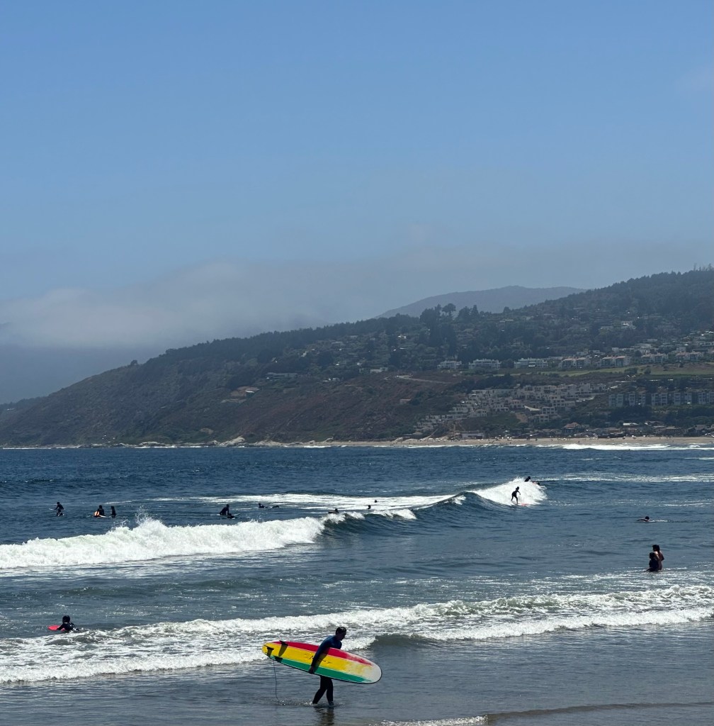Only two hours from Santiago (unless you’re on a bus), Maitencillo is a popular weekend trip from the city. It’s strung out across two long bays with the usual water-front collection of restaurants and bars. The Humboldt current[1] means the water temperatures is lower than you’d expect, and it also brings with it a cooling breeze, which, despite the strength of the summer sun means evenings can be chilly. After a long, laden walk to my hotel from La Laguna, I head to the beach to take it in – more or less on the latitude of Sydney, with no land in between. Half the globe of nothing but Ocean ahead of me. I’m not here on a geography field trip, though, I’m here for the surfing.